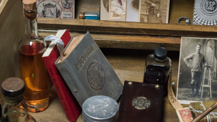 Sur ce stand, on trouve de tout, sauf de l’ordinaire : œuf de dragon, baguettes magiques, photo hantée, tarot divinatoire… une multitude d’artefacts aux pouvoirs plus étranges les uns que les autres.
